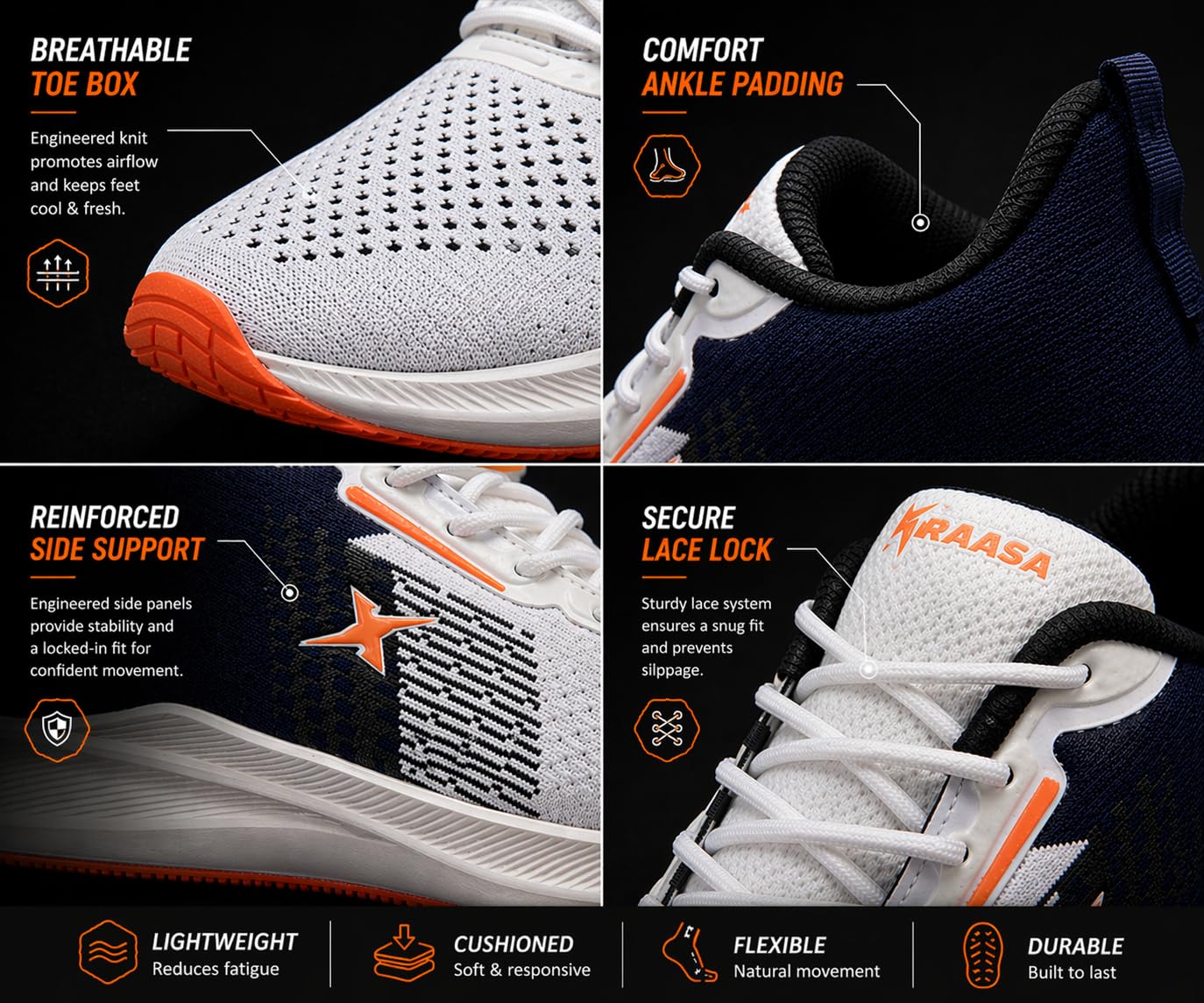 Step into comfort with Kraasa men’s running shoes featuring breathable mesh upper, lightweight phylon sole, and cushioned EVA insole. Designed for flexibility, shock absorption, and all-day comfort for running, walking, and daily wear.